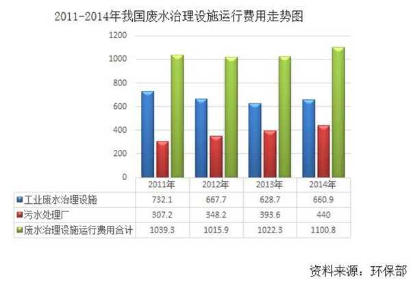 废水治理设施运行费用包括工业企业废水治理设施和污水处理厂两个部分。2014年,废水治理设施运行费用1100.8亿元。其中,工业废水治理设施费用660.9亿元,占废水治理设施运行费用的60.0%,比2013年增加5.1%;污水处理厂运行费用440.0亿元,占废水治理设施运行费用的40.0%,比2013年增加11.8%。