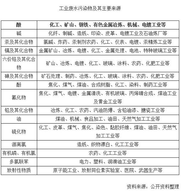工业废水污染物及其主要来源工业废水必须达到一定标准后才能排放或者进入污水处理厂进行处理。虽然工业废水常以废水中含量较多的成分或者毒物来命名,但实际操作时,各个企业未必知道自己的废水所含的主要成分是什么,所以在日常生活中我们更习惯按行业来给废水分类,例如造纸废水、印染废水等,工业废水排放标准也是按照行业来制定的。