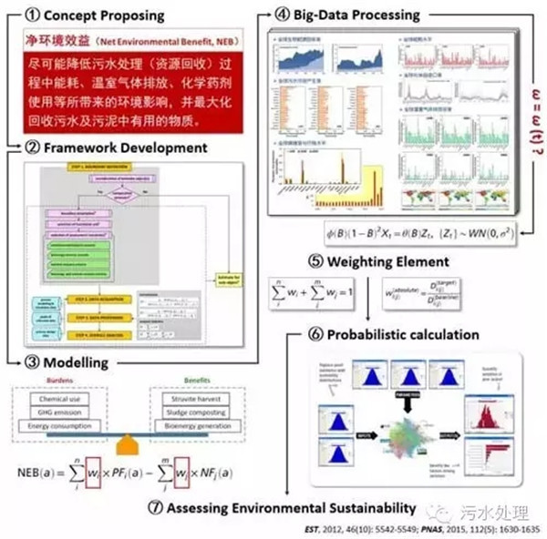 针对这一问题,来自中国科学院生态环境研究中心的研究人员提出了净环境效益(NetEnvironmentalBenefit,NEB)的概念,即通过技术和政策等多维度去降低污水处理过程中因能耗、化学品使用和温室气体排放等问题产生的环境影响,并最大化循环和回用污水及污泥中的有用物质。针对这一概念,他们构建出面向节能、低碳与资源深度回收的污水处理多目标评估框架,并利用计算模拟与大数据方法,发展了指标权重算法及情景时序预测工具。