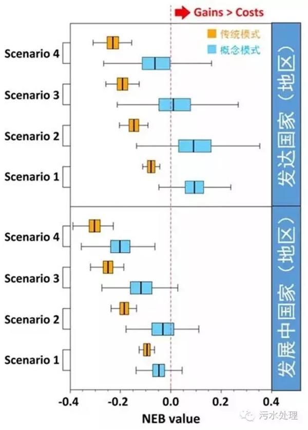 其中,发达国家实施新型污水处理模式后,污水处理的环境可持续潜力提高了1.5倍,而该数字对发展中国家而言不到0.6倍。Monte-Carlo分析进一步指出,发达国家推动模式改革后,污水处理获得净环境效益(NEB>0)的概率约65%,而发展中国家实现同一目标的可能性低于10%。从结果来看,虽然仍存在一定程度的不确定性,但依然给我们传递了非常强的信号:回收污水资源确实有利于提高污水处理的环境可持续能力。