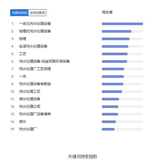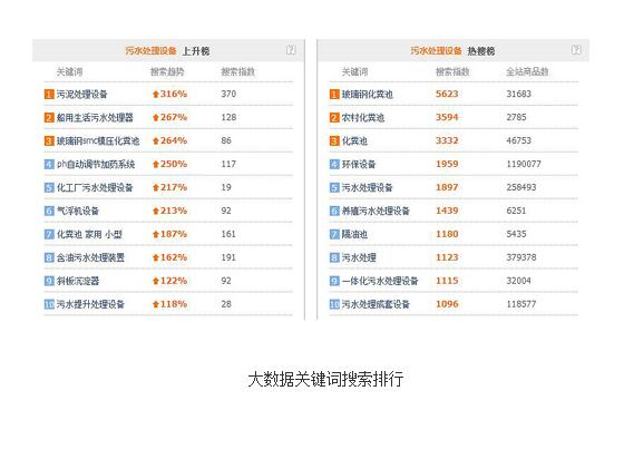 搜索关键词前两位的一体化污水处理设备和地埋式污水处理设备是污水处理厂和公共场所最常用的污水处理设备。同时,我们也可以洞悉这两款污水处理设备的市场份额,搜索量如此之高,可见这两款污水处理设备需求量之大。环保设备厂商可以在一定程度上增加这两款设备产量。