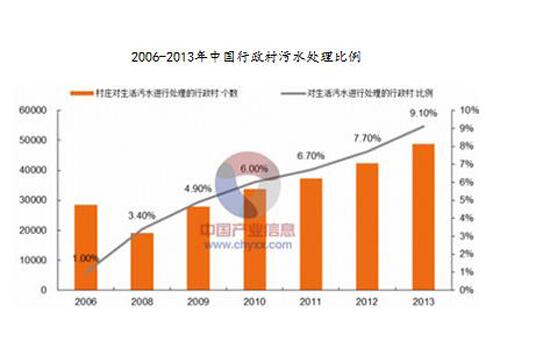 农村是未来污水处理设备的又一片蓝海市场,近年来实施污水处理的行政村数量快速上升,2013年达48851个,处理比例达9.10%,普通村庄是小于行政村的,所以整体农村污水处理率低于10%。随着人们生活水平的提高和环保意识的增强以及国家的大力扶持,未来比例一定会继续上升。